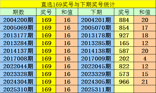 第2025310期3D奖号为:169,历史上该号码直选开出10次,下期号码分别为:884、854、927、165、587、202、822、573、966。