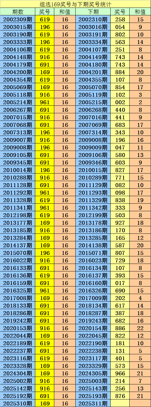 第2025310期3D奖号组选为:169,历史上该号码组选出现52次,下期号码分别为:258、054、802、563、251、743、743、884、107、854、102、002、440、441、683、343、196、047、580、603、827、771、082、098、838、333、503、927、170、165、587、807、729、107、393、017、690、202、617、387、682、886、822、181、131、401、573、966、214、256、876。